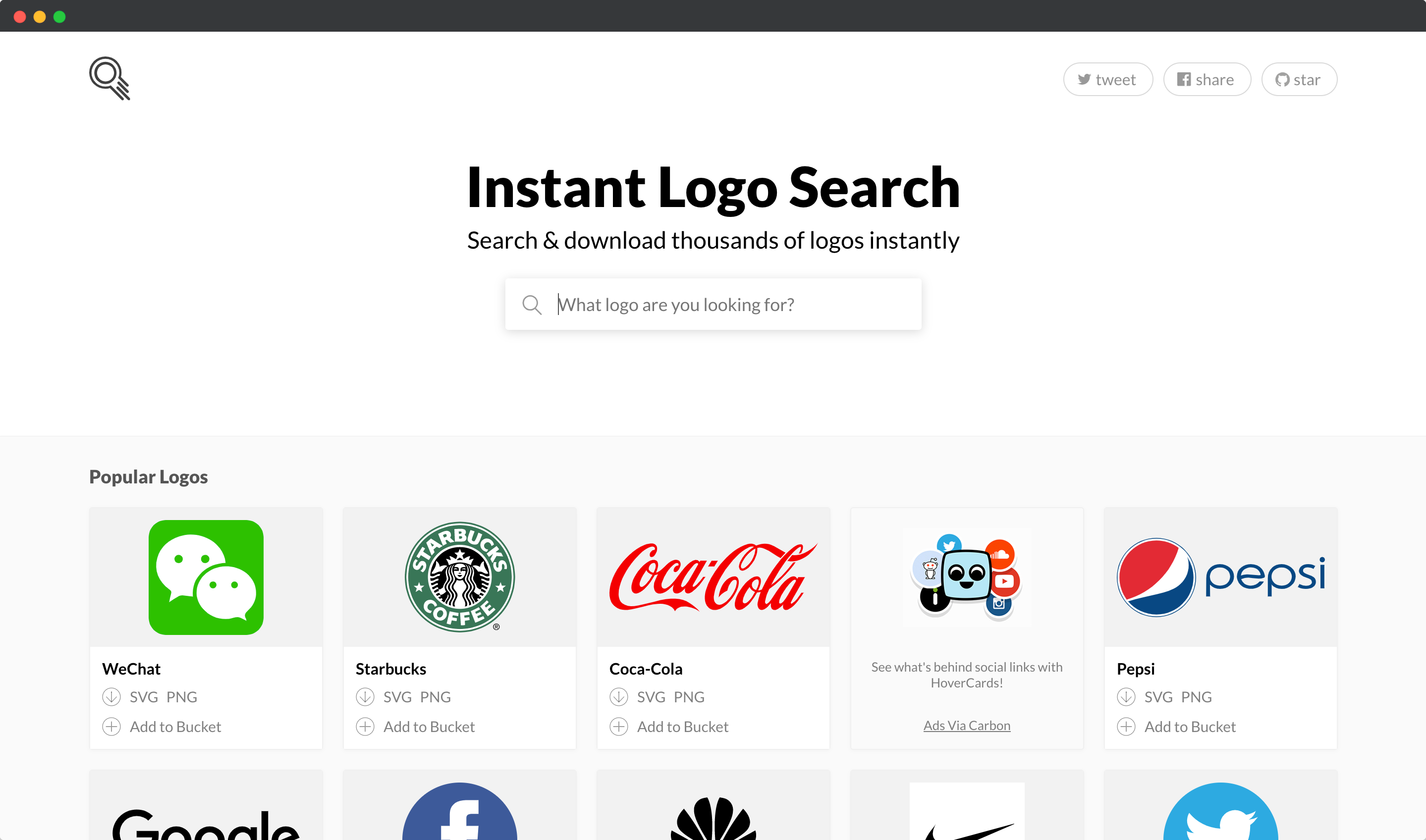 有个非常好用的功能是:每个标志下方均有「Add to Bucket」链接,点击它即可添加到批量下载的位置(在网站底部),此时你选择完 LOGO 后,就可以点击「Download SVGs」或「Downloads PNGs」链接来下载了。